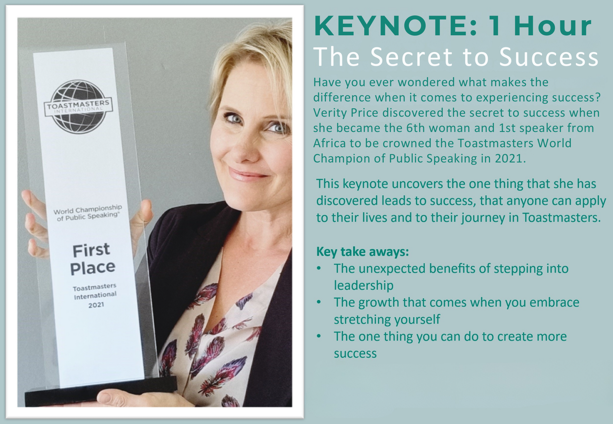 - “The Secret to Success” — Verity Price, winner of the 2021 World Championship of Public Speaking.