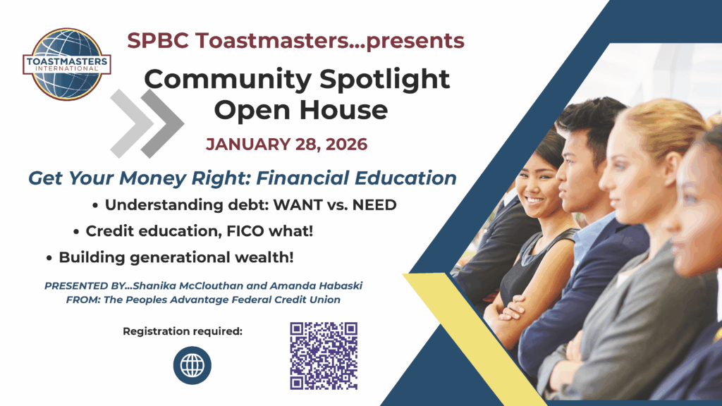 Join SPBC Toastmasters on Zoom on January 28, 2026, for an educational open house. You will learn what you need to do to "Get Your Money Right," a fantastic financial educational opportunity.