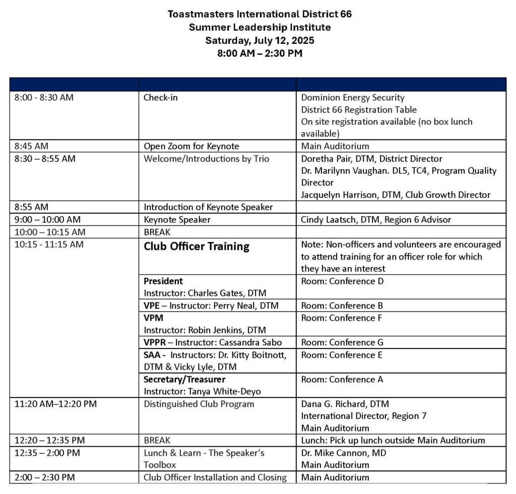 In addition to officer training, we are excited to offer two valuable elective sessions. One of these will focus on unlocking the full potential of the Toastmasters Distinguished Club Program (DCP). Presented by Dana Richard, DTM, International Director for Region 7, this session will guide you in aligning your club’s goals and activities with the DCP framework—not merely as a scorecard, but as a strategic roadmap and playbook for sustained growth, member engagement, and club and district excellence.