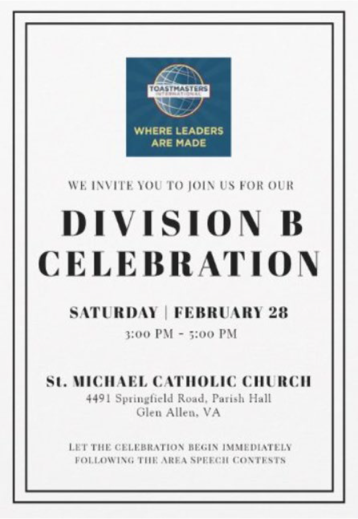 4491 Springfield Street, Glen Allen, VA 23060Join Division B, Areas 21, 22, 23, 24, 25, 26, and 27, for their Joint Area Speech Contests and support the contestants in the International and Table Topic speech contests.