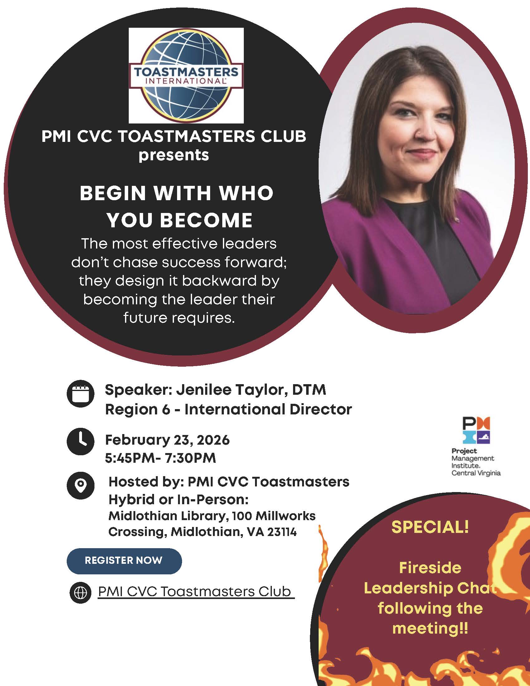 PMI CVC Toastmasters Event with Jenilee Taylor, DTM (Zoom or In-Person)